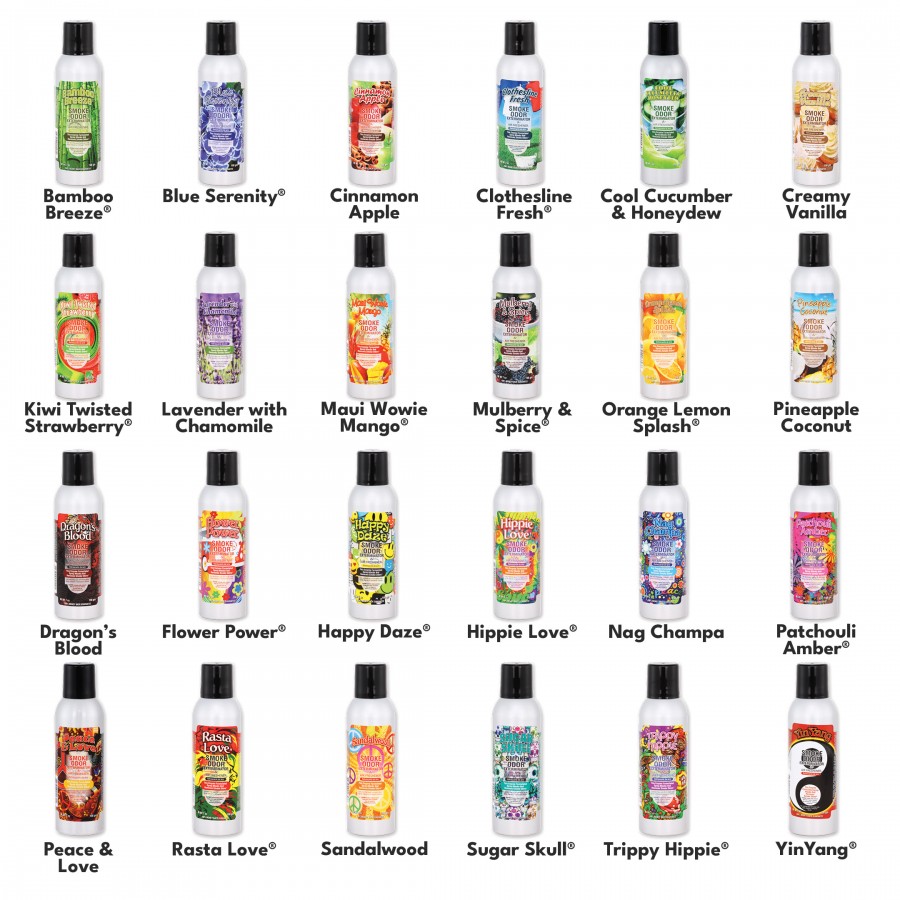 Bamboo Breeze, Blue Serenity, Blueberry Dreamz, Bubbly Minosa, Cherry Bomb, Cinnamon Apple, Clothesline Fresh, Cool Cucumber & Honeydew, Creamy Vanilla, Dragon's Blood, Flower Power, Grovn'n Grape, Happy Daze, Hippie Love, Island Rain, Kiwi Twisted Strawberry, Lavender with Chamomile, Lemon Haze, Maui Wowie Mango, Mulberry & Spice, Nag Champa, Ocean Breeze, Orange Lemon Splash, Patchouli Amber, Peace & Love, Peace River, Pineapple Coconut, Rasta Love, Sandalwood, Sea Glass, Shave Ice, Sour Applez, Sugar Skull, Tangie, Trippy Hippie, Tropical Fiesta, Yin Yang |